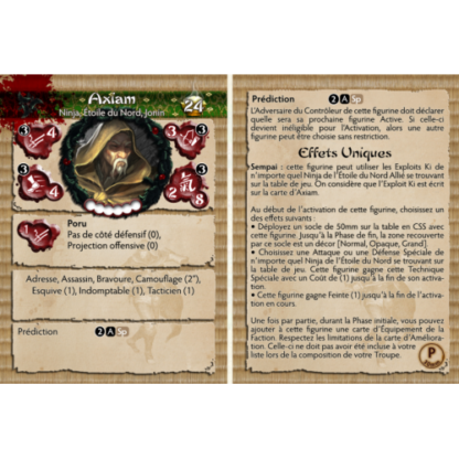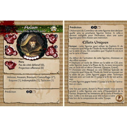 Axiam est un Jonin ou « High Man » dans le Shadow Wind Clan. Il s’est avéré plus grand que les Shadow Crows et enseigne maintenant à ceux qui seraient North Star Ninja. Certaines missions doivent encore être supervisées par des mains plus expérimentées et Axiam montre pourquoi il est apte à enseigner à la prochaine génération avec ses prodigieuses compétences. Dans le jeu, Axiam a des compétences de mêlée élevées, rares parmi les ninjas et le seul modèle North Star à avoir une statistique de base aussi élevée. Sa gamme de capacités est sans précédent car il peut utiliser n’importe quel exploit de n’importe quel ninja de North Star. Il ajoute à cette imprévisibilité avec sa règle d’équipement vous permettant de choisir une carte d’équipement en milieu de partie en fonction des