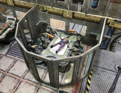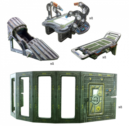 Ce pack contient tout ce dont vous avez besoin pour mettre à niveau votre table de jeu de science-fiction avec un laboratoire de recherche médicale ou une infirmerie. Il comprend des cloisons de quarantaine qui se connectent aux murs standard, et la base Auto-Doc est réversible pour un look alternatif. L’ensemble est compatible avec tous les ensembles de base de science-fiction Battle Systems.