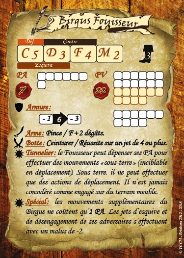 Doté d’une Constitution et d’une carapace solides comme tous ses congénères, le Fouisseur se jouera des armes de réaction comme l’arbalète des Miliciens ou d’autres encore à venir. Un profil de guerrier qui permet enfin de jouer « Full Crabe » chez les Bannis…