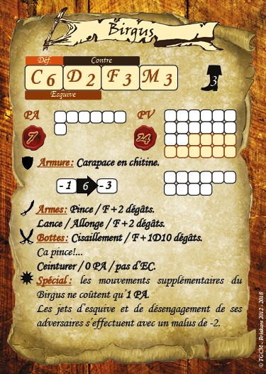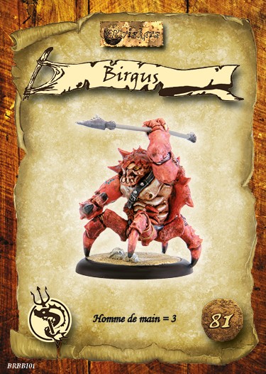Les birgus sont des créatures endémiques de l’Archipel, ils ont très vite compris leur intérêt à travailler de concert avec les Bannis. Leur grosse constitution et leur carapace naturelle en font de redoutables adversaires au corps à corps.