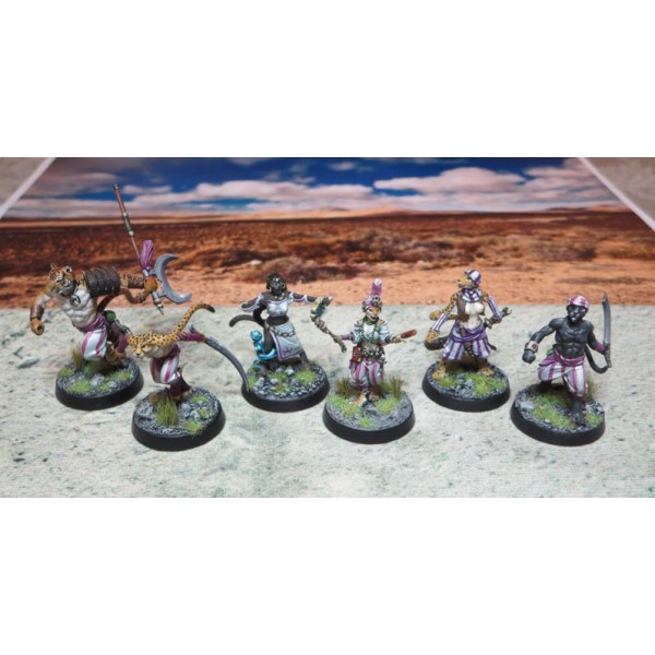Troupe composée de 6 figurines en résine (Cheikh Araoui, Oracle, Ghulam, 2 Jarayas, Méhariste), fournies avec cartes de profils et socles en plastique noir. Non peintes et à assembler.