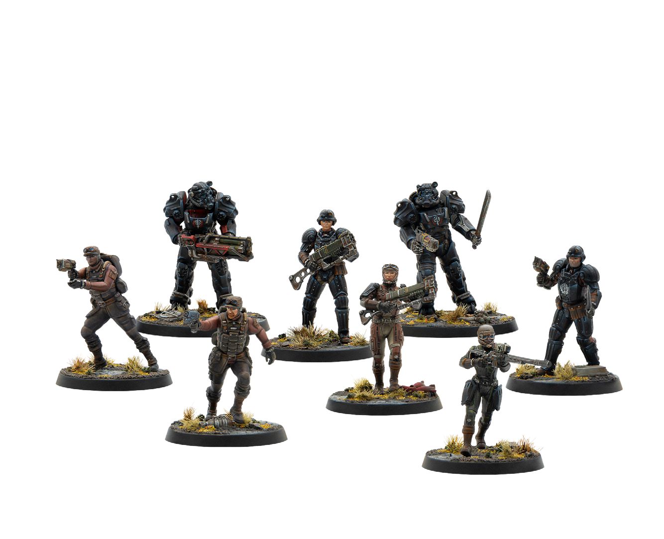 En patrouille, la Confrérie de l’Acier se déplace comme une unité hautement entraînée. Rigoureusement entraînée et loyale les unes envers les autres, une seule escouade de reconnaissance peut se frayer un chemin à travers les Terres désolées comme un éventreur parmi les pillards. Souvent déployées en reconnaissance du territoire ennemi, les escouades de reconnaissance sont bien armées et guidées dans leurs objectifs par des scribes de terrain, soutenus par la puissance de feu écrasante de leurs chevaliers et paladins. Régulièrement en infériorité numérique, mais jamais en infériorité numérique ; beaucoup considèrent une petite escouade de la Confrérie comme une proie facile, mais ont rarement l’occasion de répéter cette erreur.