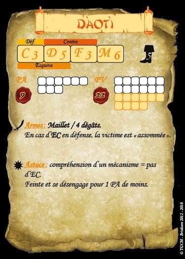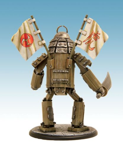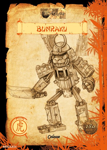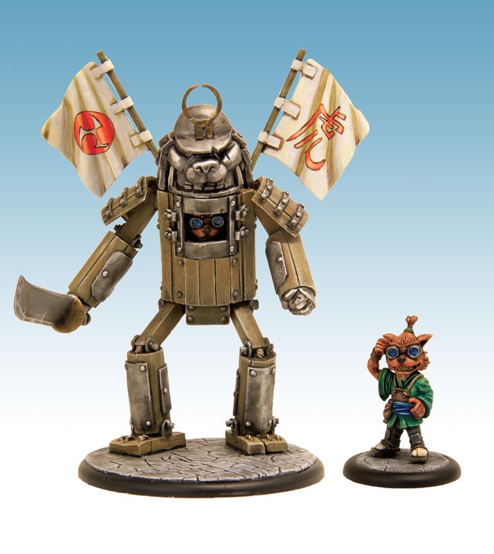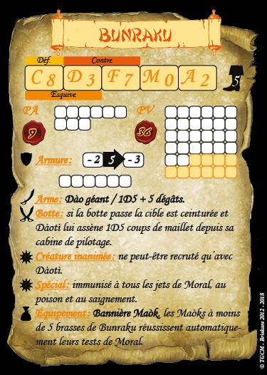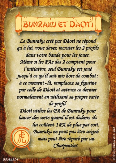 Si Bunraku ne peux pas être recruté sans son « conducteur », l’inverse est possible, et vous avez donc avec Dàotì un 6ème mage abordable chez les Maòks qui est définitivement la faction des thaumaturges. Bunraku est rassurant, il n’a pas besoin de tester son moral et évite à ses alliés d’avir à le faire, il ne subit pas la plupart des effets négatifs et a une capacité de dégâts très correcte. Mais lui aussi est un colosse lanceur de sort puisque Dàotì va pouvoir lancer des sorts d’alchimie depuis sa cabine. Enfin cerise sur le gâteau, quand Bunraku est mis hors de combat, le petit magicien est déployé dans la zone qu’occupait le colosse et s’active normalement avant la fin du tour, autrement dit vous gagnez une activation lorsqu’il arrive (mais vous ne pouvez pas décider de faire apparaître Dàotì tant que Bunraku est vaillant).