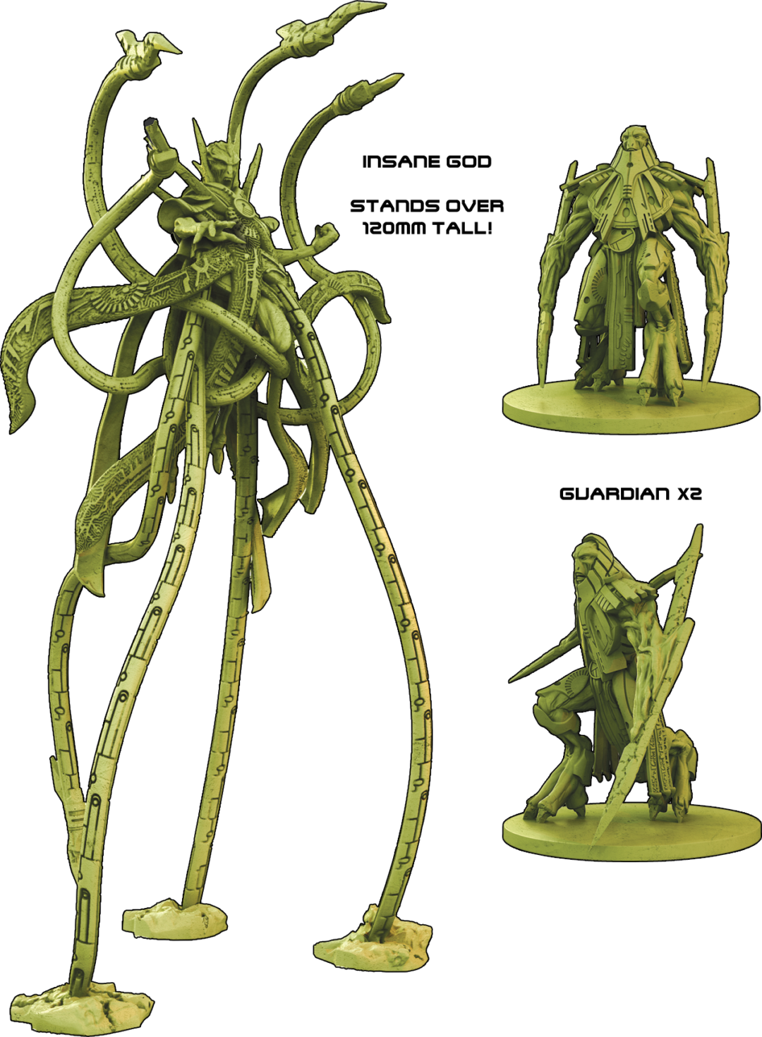 Insatisfaite des anciens dieux, une faction fanatique des Premiers nés a créé les siens, extrêmement puissants et presque indestructibles… Cette extension ajoute l’un de ces dieux fous, mesurant plus de 120 mm de haut, et flanqué de ses deux imposants Gardiens !