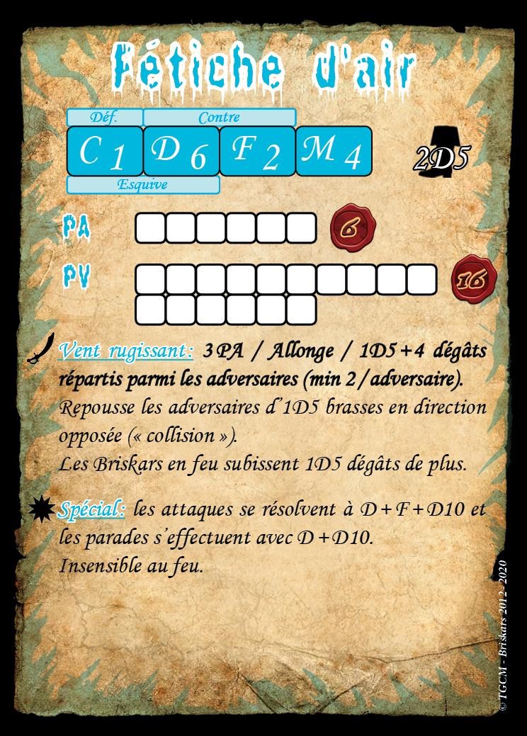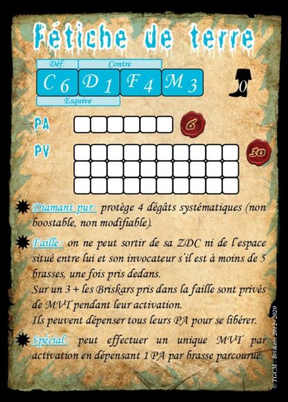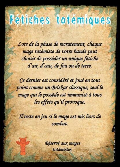 Ces 2 Figurines sont livrées avec les cartes de profils de « Fétiches » qui leur permettent d’être recrutées par les magiciens maitrisant le totémisme. Elles servent aussi à symboliser les « totems-jambe » de l’Aberration totémique dont les cartes de profil sont fournies dans le coffret de L’Aberration.