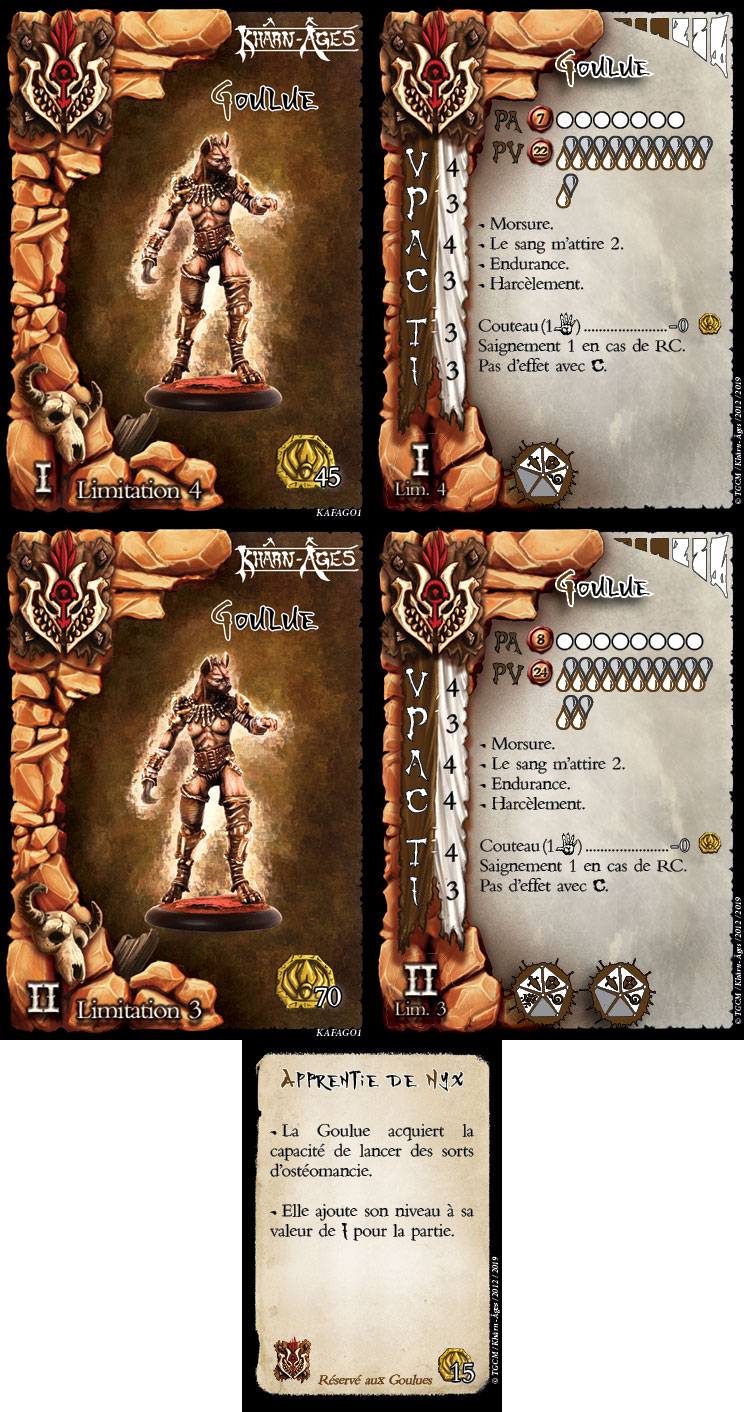 Les Goulues sont les premières représentantes féminines de cette faction matriarcale, bonnes combattantes pour leur coût, elles ont la capacité de suivre les enseignements de Nyx, leur mère à toutes, apportant aisni la magie au sein du Fer de Lance. Déclinées en Niveau 1 et 2, vous pourrez les recruter en grand nombre ou les spécialiser avec la carte « Apprentie de Nyx ».