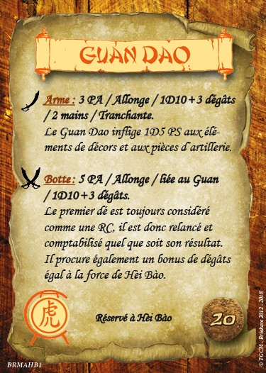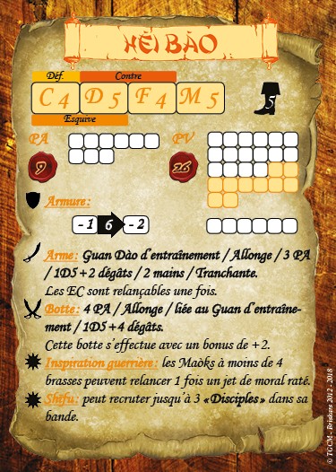 Hei Bao vient enrichir la faction des Maòks; véritable Chef de Guerre, après avoir fait ses gammes auprès des moines guerriers, elle a gravi les échelons pour diriger les nouvelles disciples de l’Empire Maòk. Redoutable guerrière, elle ne se sépare jamais de son Guan Dao.