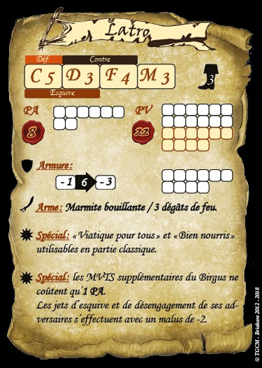 Doté d’une Constitution et d’une carapace solides comme tous ses congénères, Latro apporte les dégâts de feu aux Bannis, mais surtout va permettre de renforcer encore d’avantage l’un de ses comparses tout en permettant à la bande qui le recrute de ne pas partir au combat le ventre vide…