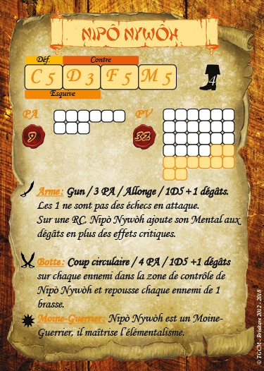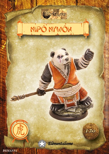 Nipô Nywôh est l’un des grands sages du temple principal de Ming Dao. Il a préféré l’art de la guerre à celui de la méditation, mais dispense sa magie pour galvaniser ses troupes et les rendre plus rapides au combat. Moine guerrier il peut utiliser le sort « Mantra » livré avec les Senglù.