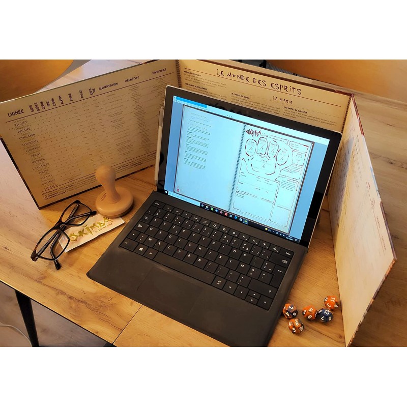 - Cet écran est en 3 volets A4 en paysages, permettant d’avoir une large zone de cache mais de garder le contact avec ses joueurs.