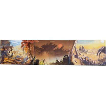 - L’écran est cartonné et robuste. Replié, il fait un A4. L’extérieur de l’écran propose une combinaison de 3 illustrations de paysages pour donner à vos joueurs le goût du voyage. L’intérieur comprend un résumé des informations les plus utilisées en jeu pour le maître du jeu.