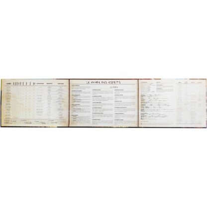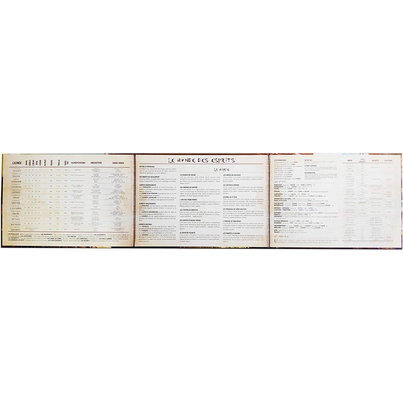 - Le volet central regroupe les informations sur le monde des esprits. Les différentes catégories d’esprits sont listées ainsi que les 12 types de magie.
