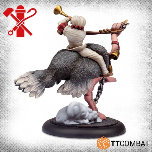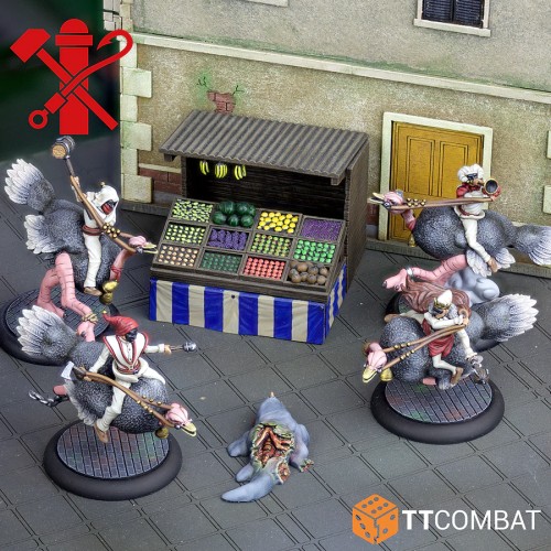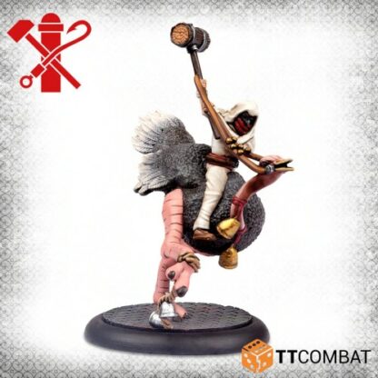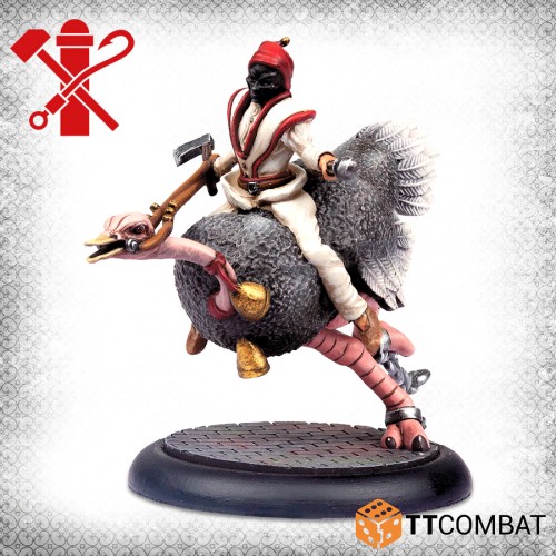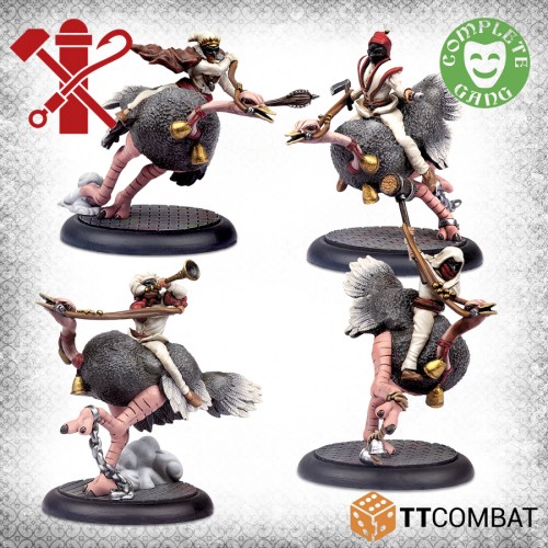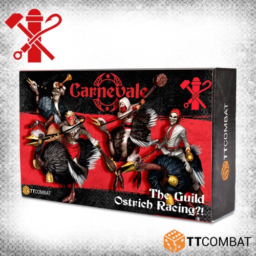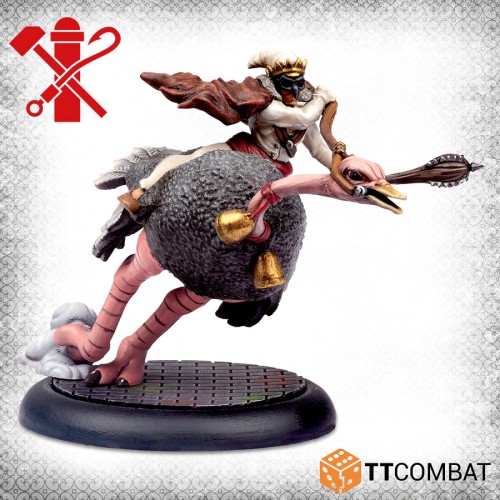 C’est vrai, vous avez bien vu. Ce sont quatre Pulcinella chevauchant des autruches. Après les avoir volées dans une cargaison destinée aux Docteurs, ces bêtes bipèdes sont la monture parfaite pour une bande de Pulcinellas fous ! Cette boîte contient en fait un gang entièrement légal. Avec deux cavaliers d’autruche comme choix rapides d’homme de main, une autruche très bruyante (celle qui sonne une corne) comme choix de héros de soutien et le roi de l’autruche comme chef, ce gang entre rapidement et est super bizarre. Juste au moment où vous pensiez avoir vu tout ce que Carnevale a à offrir !