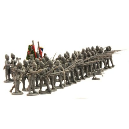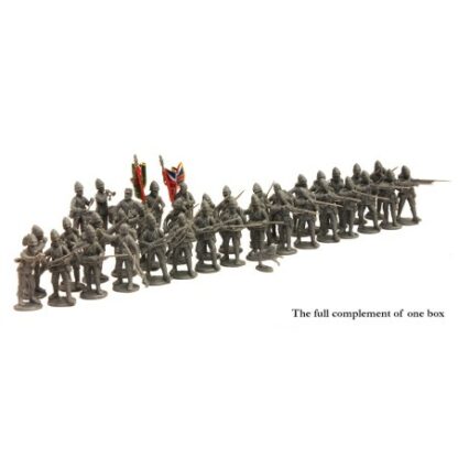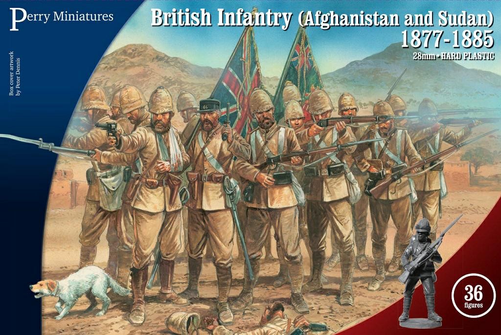 Cette boîte contient 36 pièces d’infanterie britannique polyvalentes en plastique conçues pour la deuxième guerre d’Afghanistan, le Soudan et la troisième guerre anglo-birmane.