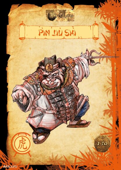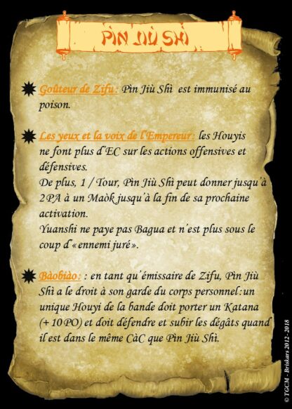 Pìn Jiù Shì, le goûteur personnel de l’empereur Zìfù dont l’embonpoint fait pâlir les pandas et vient apporter son soutien à de nombreuses figures de la faction: Yuanshì qui pourra user de Bagua gratuitement, les Houyis qui oublieront la saveur d’un EC, et le reste de la bande à qui Pìn Jìù pourra faire don de 2 PA (comprenez qu’il en perd lui même 2 pour le tour) aux plus nécessiteux.