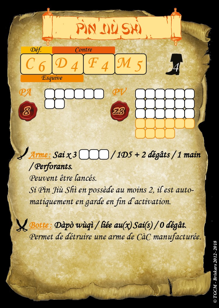 À noter que, nous nous excusons platement pour cette erreur, sur la première série de cartes du goûteur Pìn Jìù Shì, une insidieuse 9e case de PA s’est glissée sur sa carte de profil, il n’en a que 8 comme indiqué dans le cachet de Points d’actions.
