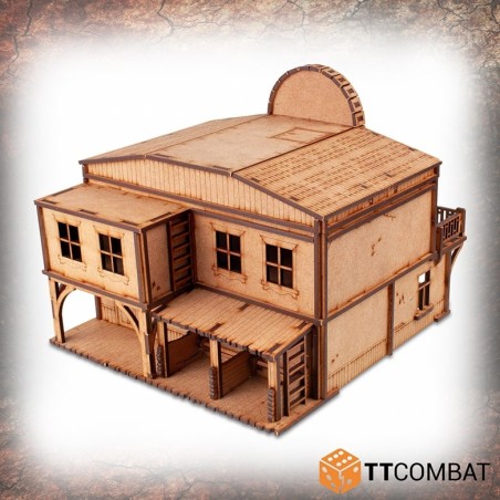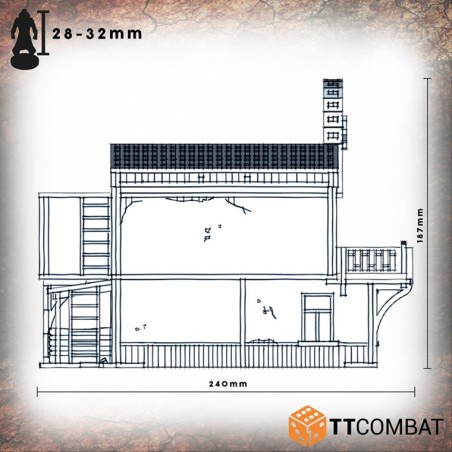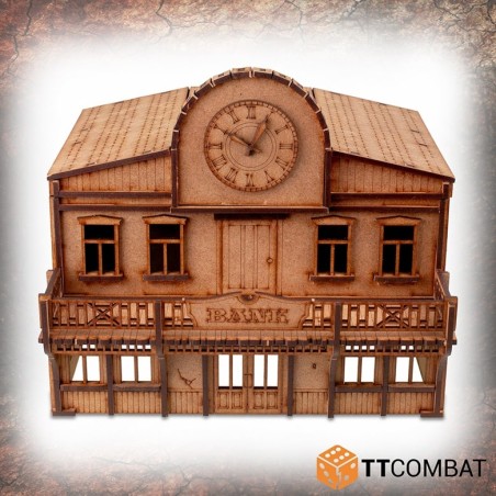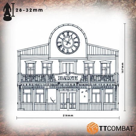 La Pitchstone Bank est fabriquée en MDF de 3 mm d’épaisseur. C’est un excellent kit de décor à utiliser dans les jeux d’escarmouche sur le thème du Far West, et il fonctionnera parfaitement avec les jeux et les figurines de 28 à 32 mm.