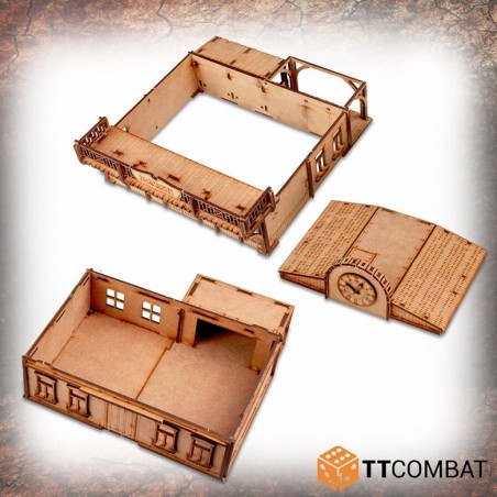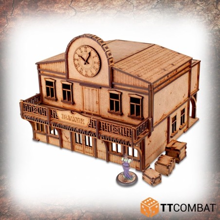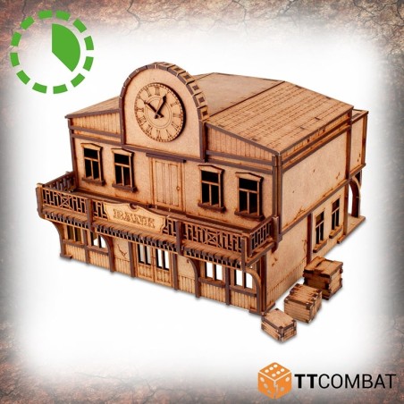 La banque Pitchstone comprend un grand bâtiment et un ensemble de caisses. Ces deux éléments constituent un ajout brillant à une table sur le thème du Far West, en plus de leur esthétique accrocheuse. Elle offre de nombreuses fonctionnalités de jeu, telles que des toits amovibles, permettant de jouer à l’intérieur. De plus, les toits plats offrent une surface supplémentaire sur laquelle jouer. Les caisses et les rebords de fenêtre ont été conçus pour offrir une large ligne de vue à vos figurines.
