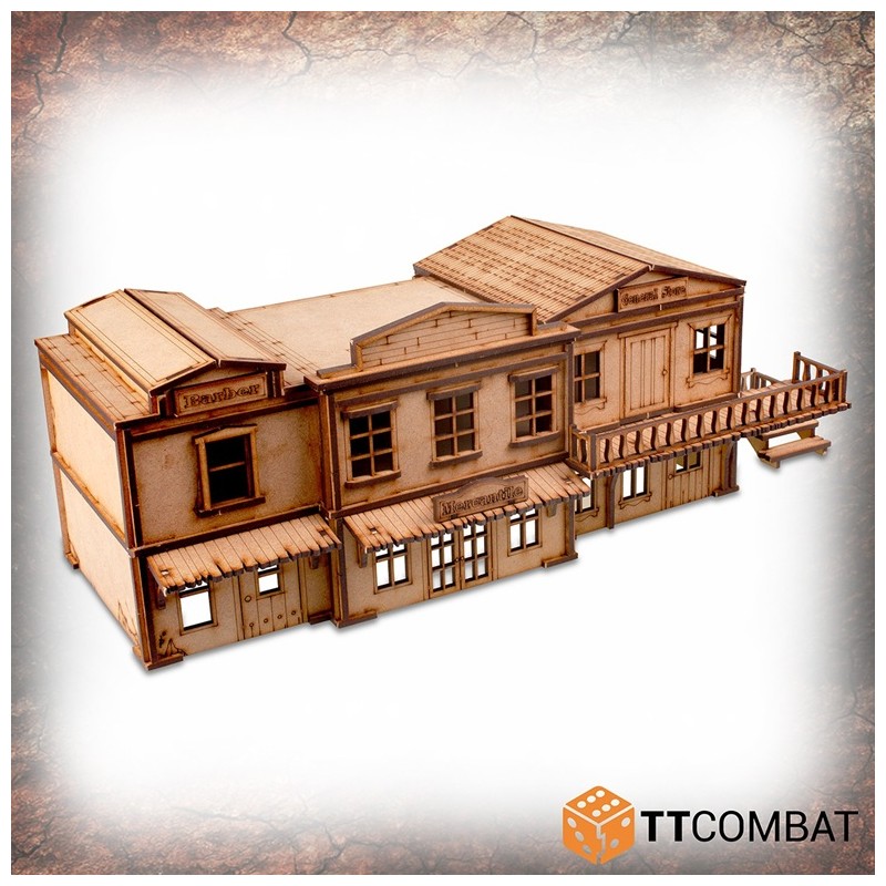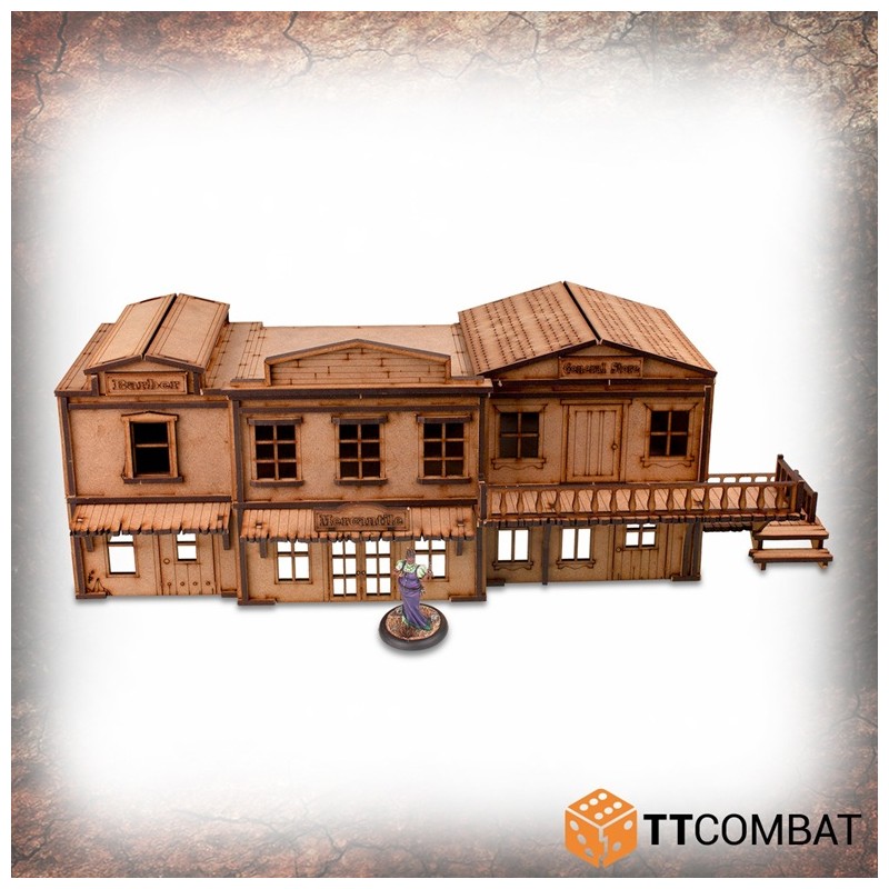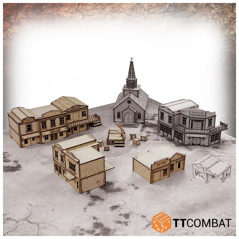 La Pitchstone Main Street est assez grande pour accueillir au moins deux cow-boys. Elle se compose de 3 bâtiments, d’une potence et d’une sélection de caisses. Les trois bâtiments suivent la même philosophie de conception, avec des toits amovibles permettant de jouer à l’intérieur. De plus, les toits en pente ont été testés afin de trouver l’angle parfait pour que les figurines puissent s’y percher sans glisser.