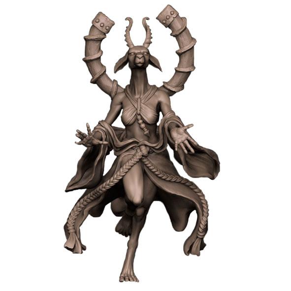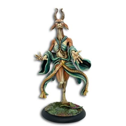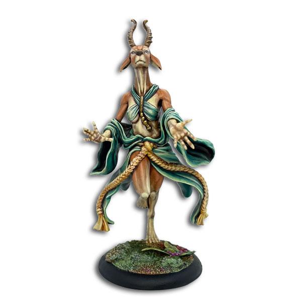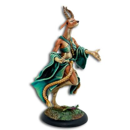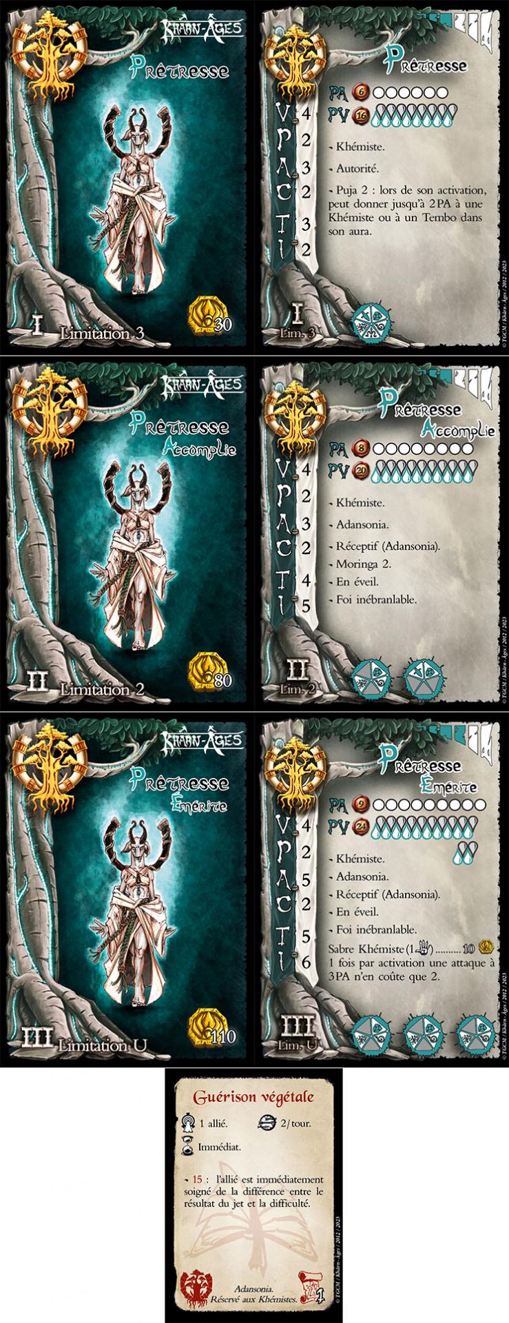 1 figurine de Prêtresse khémiste, son socle de 40mm, ses 3 cartes de niveau et 1 carte de sort.