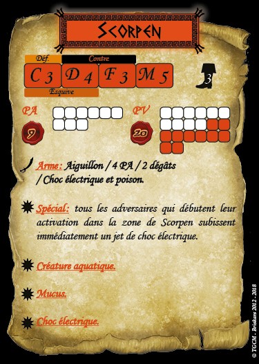 Scorpen est par nature une créature fuyante et discrète. Contrairement aux Ichtiens il préfère passer inapercu afin de pouvoir soutenir ses troupes et surprendre l’ennemi par la puissance de sa magie.