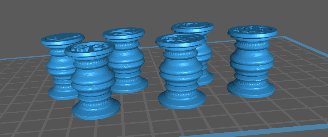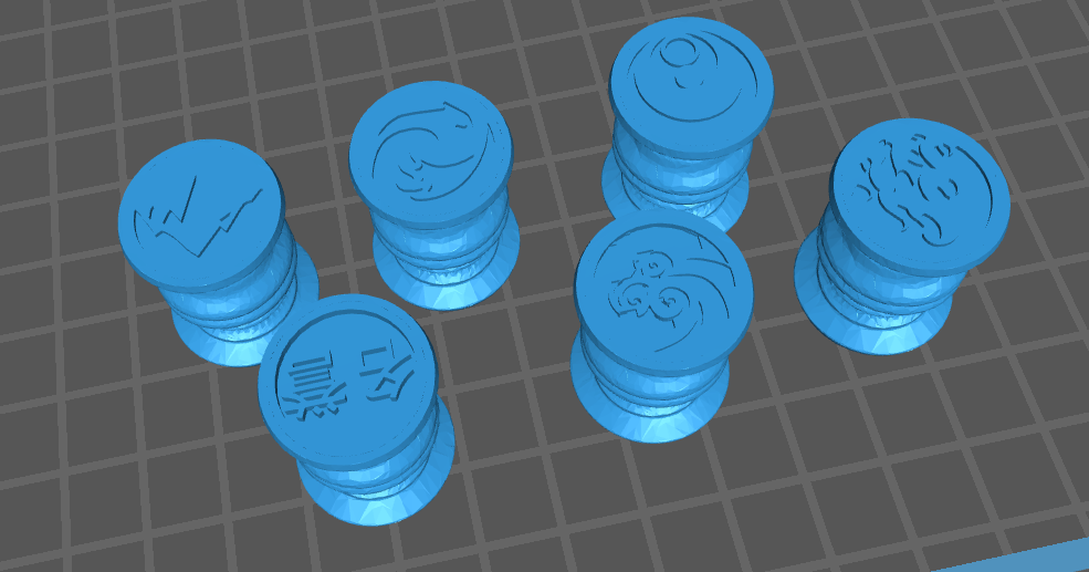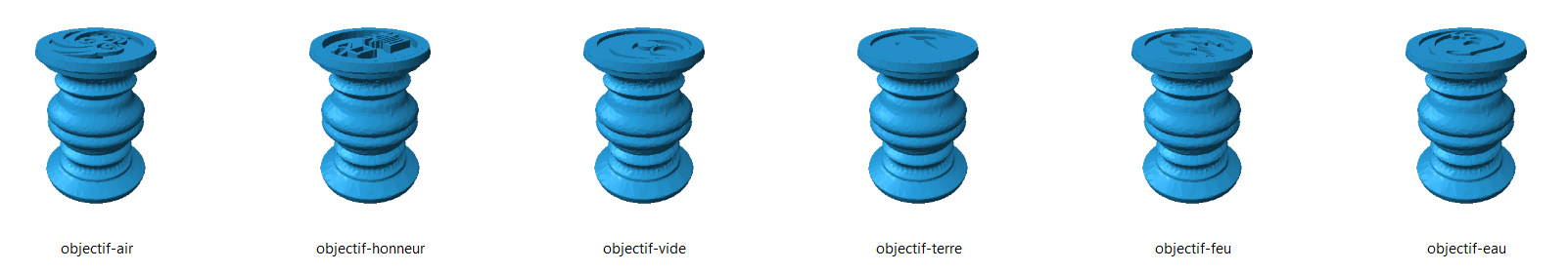 Kit de 6 objectifs imprimés en résine standard. Sur le dessus, chauque objectifs suppporte un Kenji représentant chacun un éléments différents.