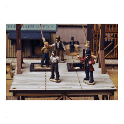Le set contient 4 figurines. Il y a un bourreau, un homme qui se prépare à être pendu, un exécuteur (celui qui est prêt à tirer la poignée) et enfin un annonceur qui dit à la foule rassemblée de quoi sont coupables ceux qui sont sur le point d’être pendus. Figurines à assembler et à peindre.