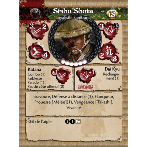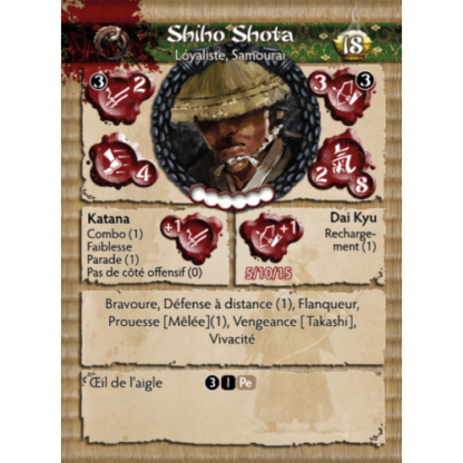 Shiho Shota offre la mort à distance ! Ayant perfectionné l’art martial du Kyudo qui permet à un archer de tirer à l’arc avec une précision étonnante, il est devenu une légende en son temps. Il a même réussi à tirer une flèche projetant le centre circulaire d’une lune d’argent qui a été lancée haut dans les airs alors qu’il avait les yeux bandés ! Mais Shiho Shota est bien plus que des trucs et des parades pour la foule ; il a consacré toute sa vie à maîtriser l’arc, à tel point qu’il n’est pas un instrument entre ses mains mais une extension de son corps et de son esprit combatif féroce. Les années ont été dures pour Shiho Shota, toujours chassé et en fuite de l’usurpateur Dragon, mais telle est sa détermination; il n’a jamais laissé cela l’épuiser. Il n’a fait que doubler sa volonté de se battre maintenant que l’Aigle noir est rentré chez lui !