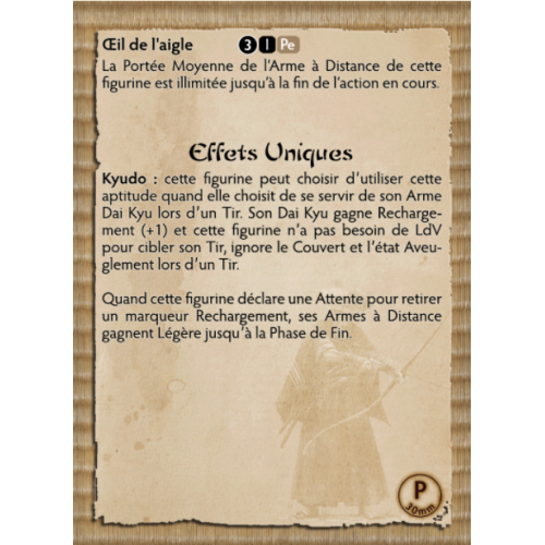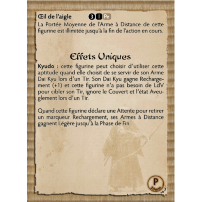 Si vous souhaitez diriger une bande de guerre Shiho avec un élément à distance, Shota est le complément parfait. Il peut tirer sur n’importe quoi de manière fiable. Bien que ses tirs Dai Kyu ordinaires soient excellents, sa capacité à ignorer la LoS (ligne de vue) pendant le tir le pousse au niveau supérieur ! Cependant, le coût d’un marqueur de rechargement supplémentaire en fait un compromis complexe. Sa capacité de mêlée est moyenne pour Shiho Samurai, mais il peut bénéficier d’une carte d’arme Enhancement Equipment. Sa capacité de mêlée est assez bonne pour achever les modèles ennemis qu’il a déjà endommagés avec son arc.