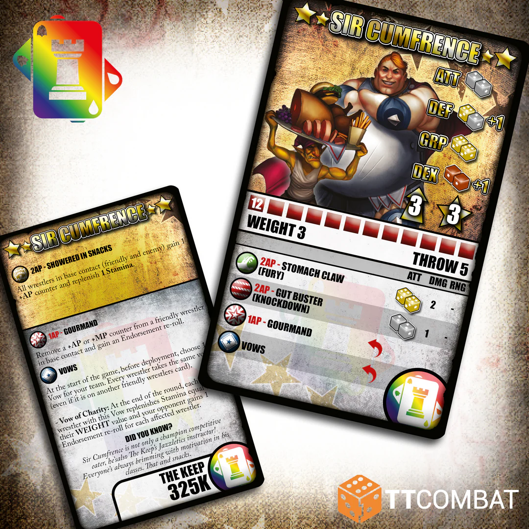 Sir Cumfrence aime manger encore plus que lutter, et cette passion se reflète dans ses talents de soutien. Gormand lui permet d’accorder des soutiens à son équipe, puis son vœu de charité permet au reste de l’équipe de rester dans le combat grâce à quelques dons comestibles. La foule soutient ce chevalier glouton grâce à son « Plaisir de la foule arrosé de friandises », qui redonne de l’endurance à tous les lutteurs à proximité.