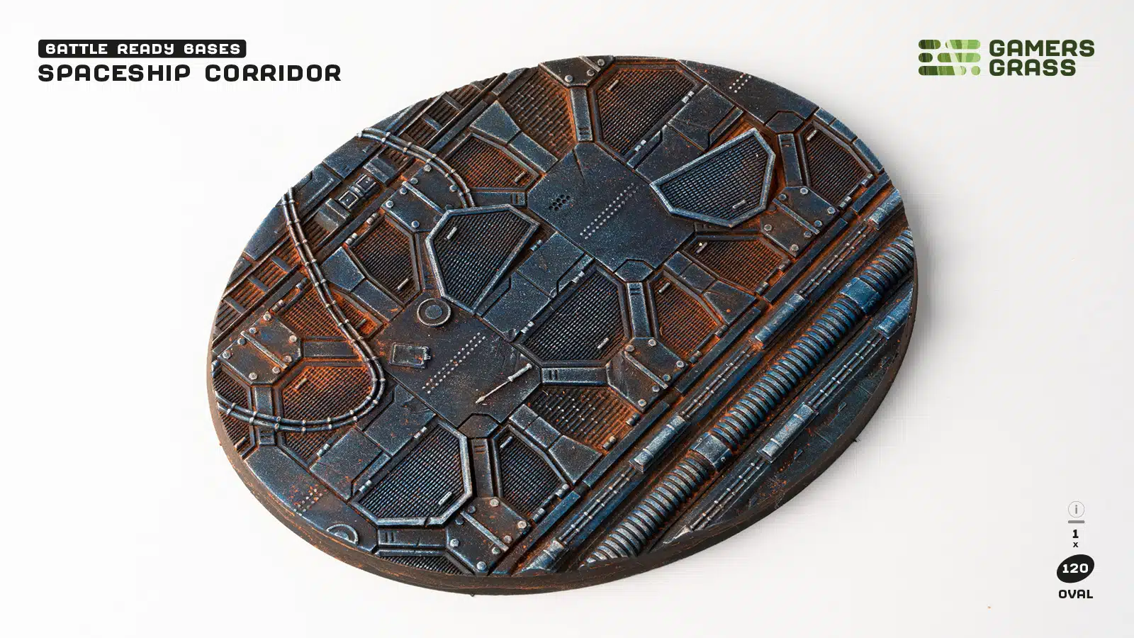 Ce blister contient 1 base de combat ovale prête à l’emploi de 120 mm de large, sur le thème des couloirs de vaisseau spatial. Les fentes au bas sont compatibles avec des aimants d’un diamètre allant jusqu’à 6 mm et d’une épaisseur de 1 mm. Les aimants ne sont pas inclus. Toutes les bases de combat prêtes à l’emploi sont déjà peintes et finies à la main.