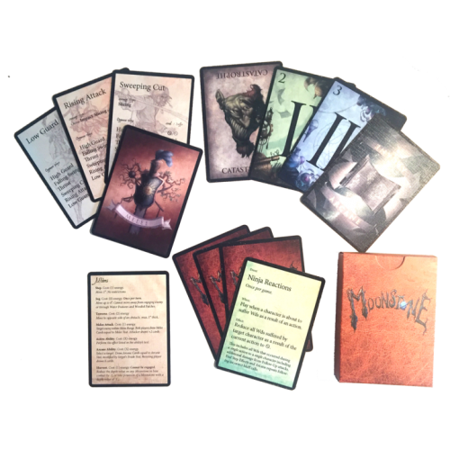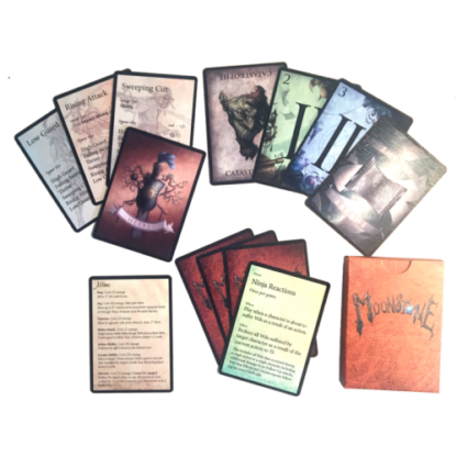 – 1 x Jeu de cartes Moonstone (18 cartes de mêlée, 21 cartes d’arcanes et 2 cartes de référence rapide)