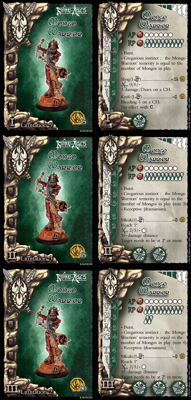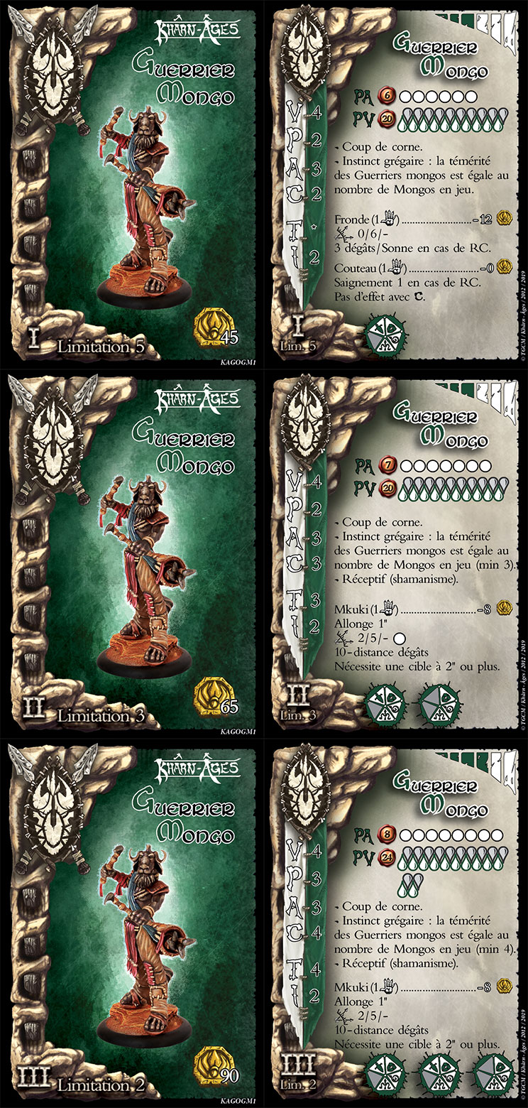 - 1 figurine du Guerrier Mongo, son socle de 40mm et ses 3 cartes de niveau.