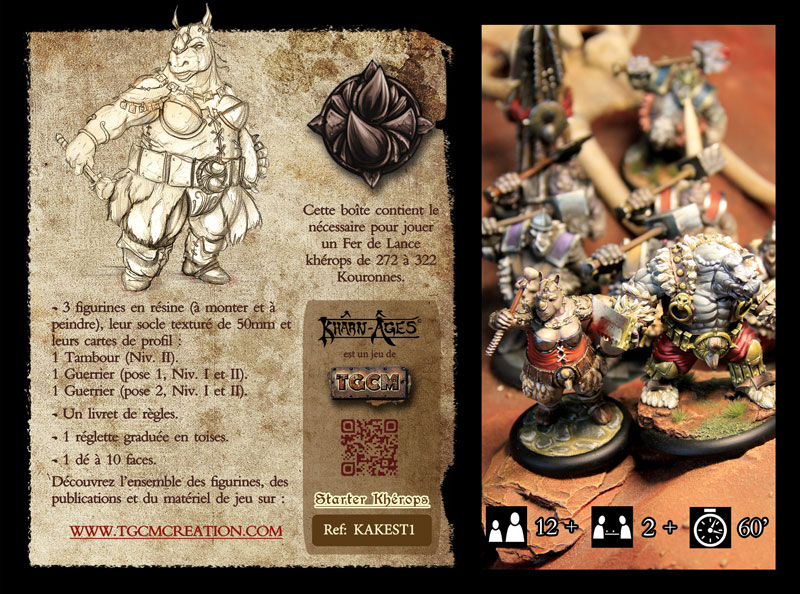 - 1 livret des règles en 56 pages (corps des règles, sans cartes d’équipement et sort, ni fluff, ni galeries) format A6.