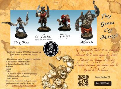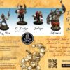 4 figurines résine et leur socle texturé de 40 mm, Cartes de profil, réglette en brasse, 1 dé à 10 faces et un fascicule de démarrage rapide Sculpture: Tommy Kaerneric Thellier. Peinture: Emmanuel Pontié.