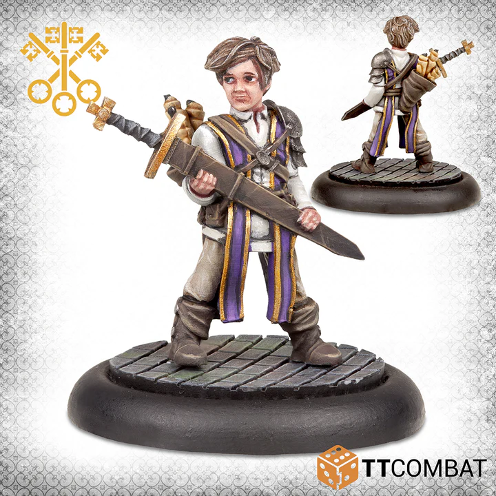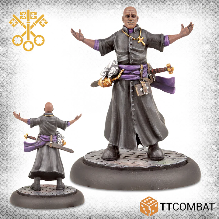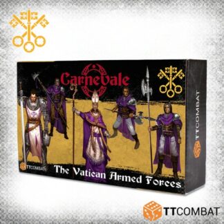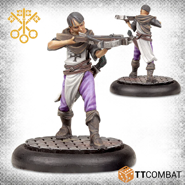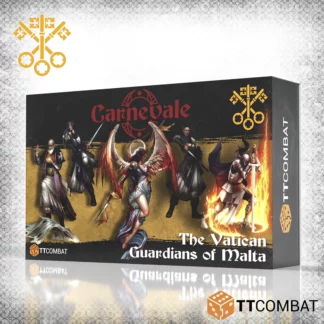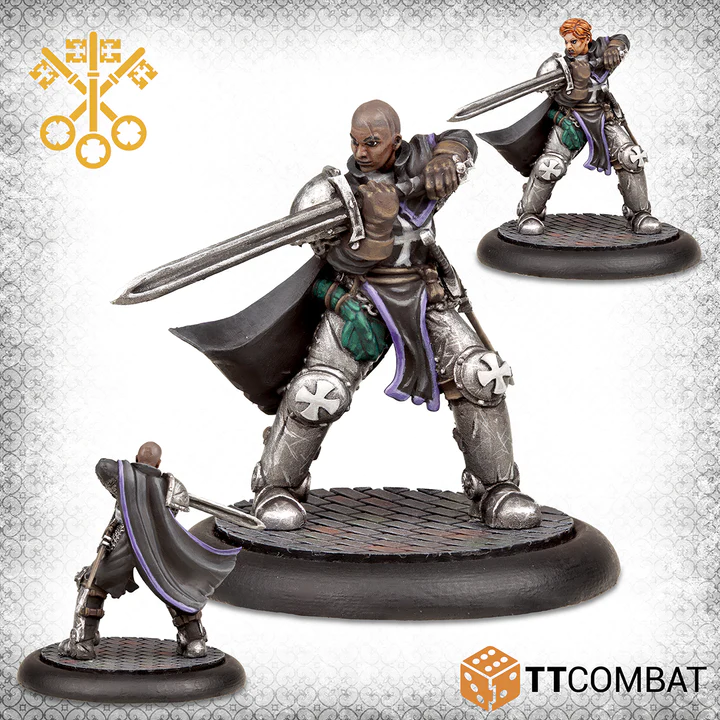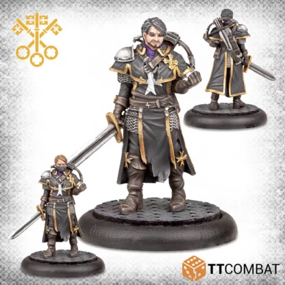 Cette boîte apporte des renforts sacrés à votre gang du Vatican. Le Templier est un héros polyvalent qui peut aussi bien infliger des dégâts à distance qu’au corps à corps. Il est accompagné d’une Vénérable de la Dévotion, une guerrière fidèle qui peut abattre les plus grands ennemis avec sa grande épée Zweihander. L’aumônier apporte la prière dans les rues vénitiennes. Ce personnage permet à tout soldat ami de voir le chemin à suivre grâce à sa communion psychique. Ces chevaliers templiers sont soutenus par leur fidèle écuyer maltais et leur page de reliquaire, qui aideront leurs maîtres de toutes les manières possibles au cours de la bataille.