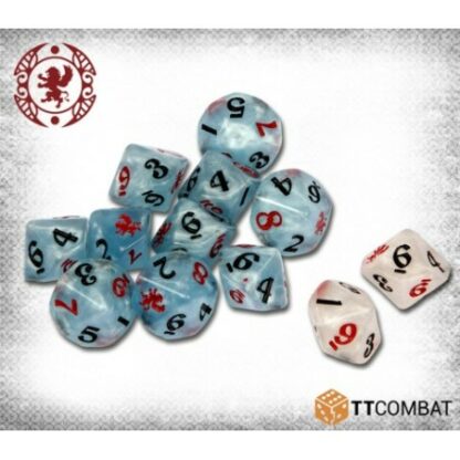 Ce pack contient 12 dés à dix faces ; 10 en bleu The Doctors (la couleur de leurs instruments magiques !), et 2 dés Destiny en blanc. Chaque numéro est délicatement gravé, le lion Carnevale prenant la place du 10. De plus, les 7, 8, 9 et le lion sont remplis d’une couleur complémentaire, ce qui rend le repérage des As plus facile que jamais !