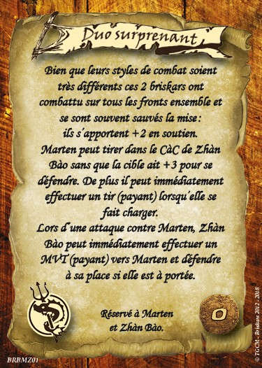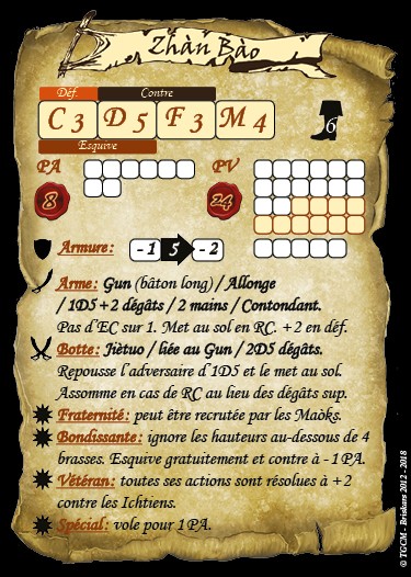 Notons que bondissante signifie pour Zhàn Bào qu’elle ne commencera à grimper qu’au delà de 4 brasses de dénivelé, mais qu’à contrario de vétéran et du vol à 1 PA, ses compagnons ne pourront pas l’imiter ou devenir « féline » sous les ordres d’Angela.